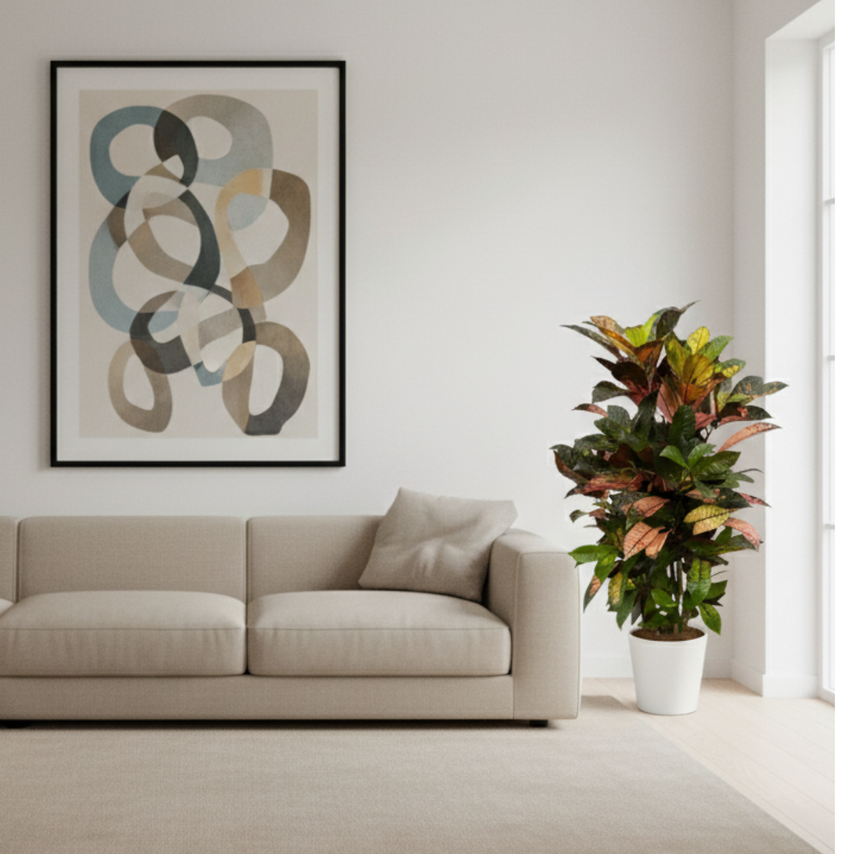 De Codiaeum Iceton houdt van helder daglicht, wat cruciaal is voor het behouden van zijn levendige kleuren en het stimuleren van nieuwe bladgroei. Een standplaats met indirect zonlicht, zoals nabij een raam op het oosten of westen, is ideaal. Als de plant te weinig licht krijgt, merk je dit aan een gebrek aan nieuwe bladeren en vervagende kleuren. Verplaats hem in dat geval naar een lichtere plek, maar vermijd direct zonlicht om bladverbranding te voorkomen.